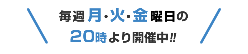 月・火・金曜日の20時~21時40分に開催しております。開催日に集まった方々で、「楽しくエンジョイしたい人」「本気(ガチ)でやりたい人」の2つのカテゴリーに分けてゲームを行います。